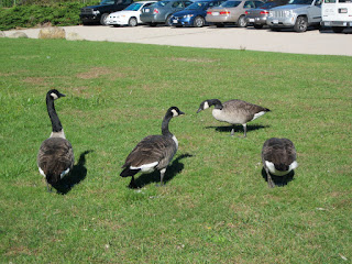 These are my visitors. I believe most of them have left. There are only four here. Sometimes we've had as many as 35 on the lawn at the same time. It is the season to fly south and the majority of them may be on their way. I suppose they will run into the hurricane that is blowing up the East Coast. My theory is that most go to the Chesapeake Bay area for the winter. I hope they find safety to sit out the storm if they are between here and there. Although they make a mess of the lawn with their leavings, I enjoy having them here. I even enjoy their honking approaches and very much enjoy their sure-footed landings.